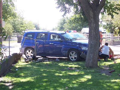The girl didn't stop at the stop sign, I guess, hit the blue car up into our yard.